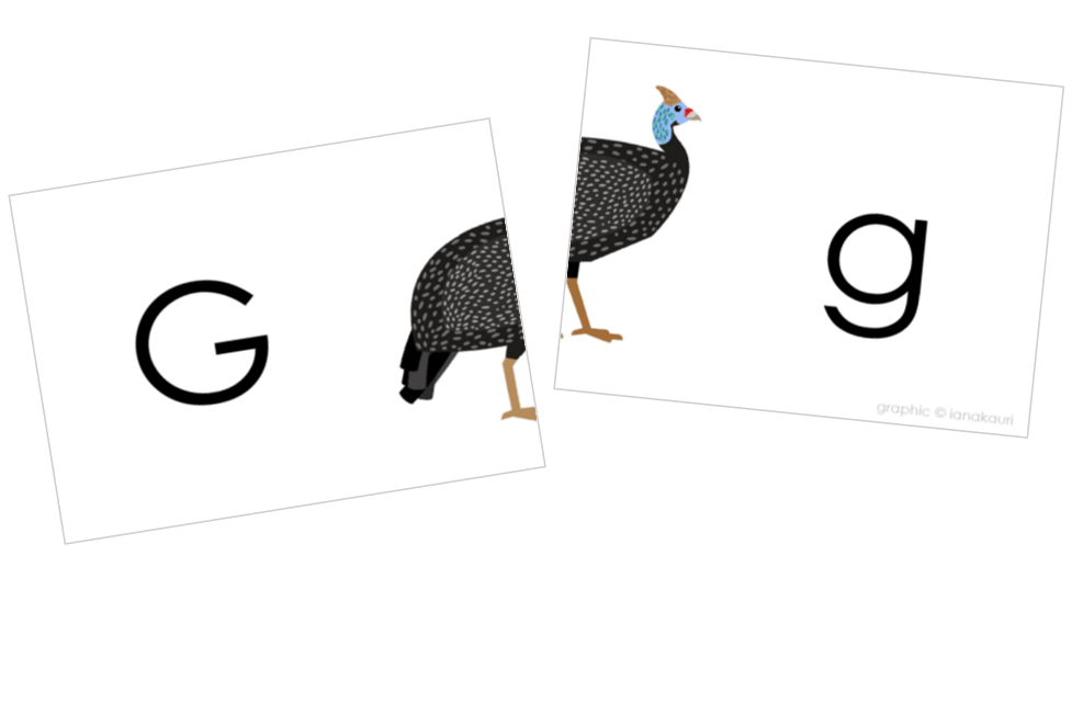 In this activity, kids match upper and lower case letters as well as the front and back half of 26 different animals. On the front side of each card, you’ll find the first letter of the animal’s name (for example, “g” is for guinea fowl below) and half of the animal. On the back side of each card, you’ll find half of the animal’s name. Simple and fun!